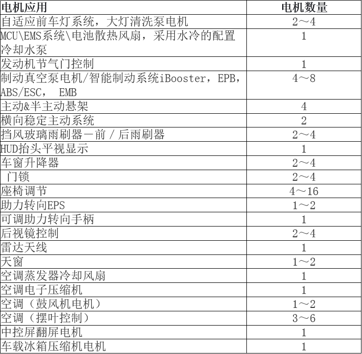 下表顯示了在典型新能源汽車中電機(jī)使用的情況?傊,凡是有驅(qū)動機(jī)構(gòu)運動之處都需要用到電機(jī),而且更多地使用了無刷電機(jī)。