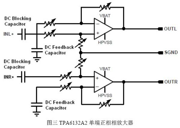 TI提供的TPA6132A2,因?yàn)槠?00dB 的高信噪比,0.01%的低失真度,出色的消除POP聲的能力,以及極高的性?xún)r(jià)比,在手機(jī)等移動(dòng)設(shè)備中,得到了廣泛的應(yīng)用。由于移動(dòng)設(shè)備芯片的集成度的提高,越來(lái)越多的芯片組選擇了單端的連接方式作為耳機(jī)通道輸出。TPA6132A2 同時(shí)提供了差分,以及單端反相放大的連接方式。但由于一些應(yīng)用,例如需要配合其他播放設(shè)備使用,對(duì)于輸出的相位有嚴(yán)格的要求,因此需要以正向的單端放大器的連接方式連接TPA6132A2。本文將討論TPA6132A2 的正向單端放大器的連接方法,以及需要注意的事項(xiàng)。