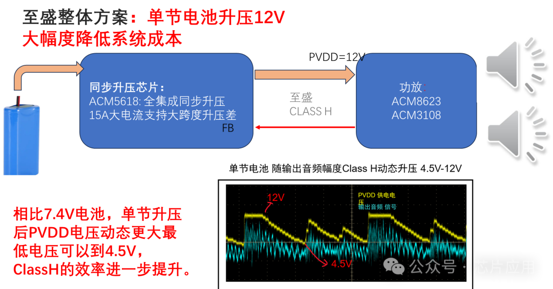 電池成本,電池保護(hù)芯片成本,充電芯片成本等整體成本得到大幅度優(yōu)化;結(jié)合CLASSH,播放時(shí)長(zhǎng)得到提升,系統(tǒng)效率上升一個(gè)臺(tái)階。