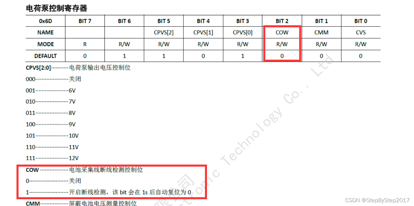 1.使能電荷泵控制寄存器COW位(電池采集線斷線檢測(cè)控制位)