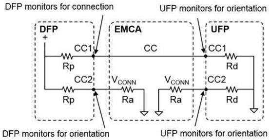 規(guī)范描述了 Type-C 上行端口 (UFP) 如何在配置通道引腳 CC1 和 CC2 上應用下拉電阻 (R d ) 以表示它是一個設備, Type- C 下游端口 (DFP) 需要在 CC1 和 CC2 上具有上拉電阻 (R p )。生成的電阻分壓器用于確定 Type-C 設備的連接和分離。每個插座中 Type-C 電纜插頭的方向很容易確定,因為電纜上只有兩個 CC 引腳中的一個連接。