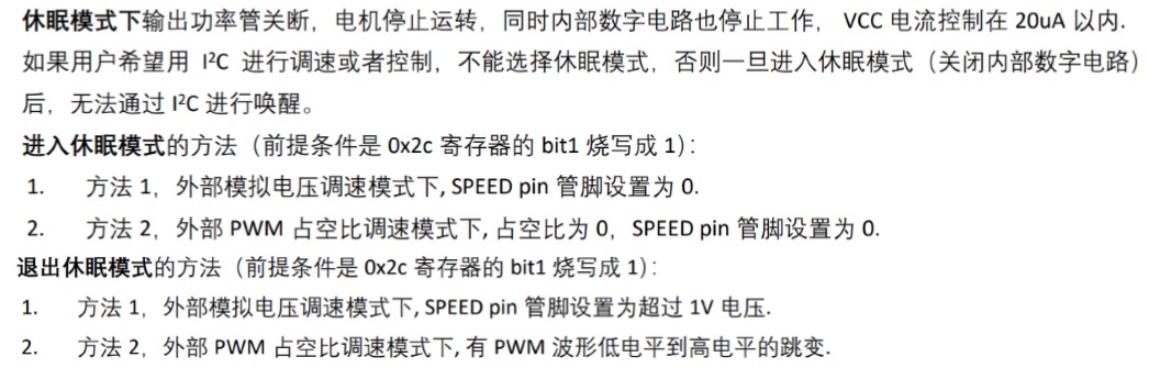 如果對功耗不是追求極致,可以接受150uA的待機電流,可以用待機模式,建議“SPEED管腳下拉到地”, 所有調(diào)速/方向控制/剎車控制都由I2C控制.