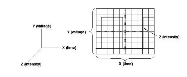 在示波器顯示屏上,橫坐標(biāo)(X)代表時(shí)間,縱坐標(biāo)(Y)代表電壓,(注,如果示波器有測(cè)量電流的功能,縱坐標(biāo)還代表電流。)還有就是比較少被關(guān)注的-亮度(Z),在TEK的DPO示波器中,亮度還表示了出現(xiàn)概率(它用16階灰度來表示出現(xiàn)概率)。