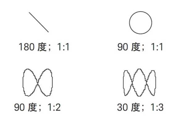 根據(jù) Lissajous 圖的形狀可以得知兩個(gè)信號(hào)之間的相位差與頻率比。圖顯示了 Lissajous 圖及其代表的相位差/頻率比。