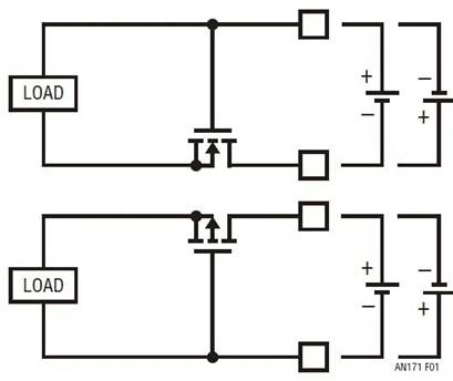 處理電源電壓反轉(zhuǎn)有幾種眾所周知的方法。最明顯的方法是在電源和負(fù)載之間連接一個(gè)二極管,但是由于二極管正向電壓的原因,這種做法會(huì)產(chǎn)生額外的功耗。雖然該方法很簡(jiǎn)潔,但是二極管在便攜式或備份應(yīng)用中是不起作用的,因?yàn)殡姵卦诔潆姇r(shí)必須吸收電流,而在不充電時(shí)則須供應(yīng)電流。另一種方法是使用圖 1 所示的 MOSFET 電路之一。
