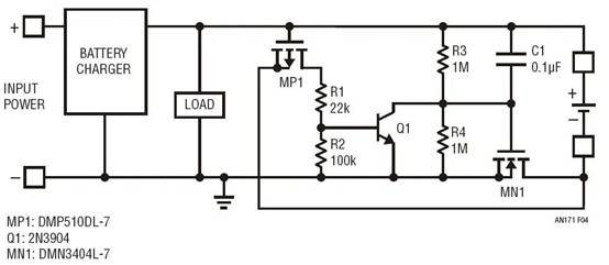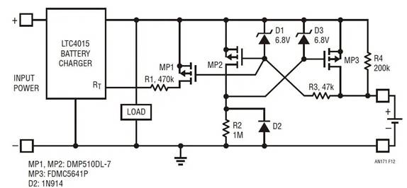 另一方面,如果充電器在電池附聯(lián)之前啟用,則 MP1 的柵極只需簡(jiǎn)單地跟隨電池充電器輸出,因?yàn)樗怯尚狗烹娮杵?R2 上拉的。未接入電池時(shí),MP1 根本沒有接通和使 MP2 脫離運(yùn)行狀態(tài)的傾向。
