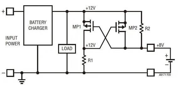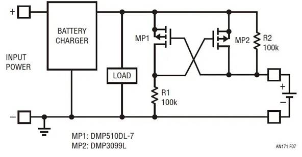 盡管比 NMOS 方法簡(jiǎn)單,但是該電路還有一個(gè)很大的缺點(diǎn)。雖然它始終提供針對(duì)反向電壓的保護(hù)作用,但是它可能不會(huì)總是將電路連接到電池。當(dāng)柵極如圖所示交叉耦合時(shí),該電路形成了一個(gè)閉鎖存儲(chǔ)元件,此元件有可能選擇錯(cuò)誤的狀態(tài)。雖然難以實(shí)現(xiàn),但存在這樣一種情況:充電器正在產(chǎn)生電壓 (比如 12V),在一個(gè)較低的電壓 (比如 8V) 附聯(lián)電池,電路斷開連接。