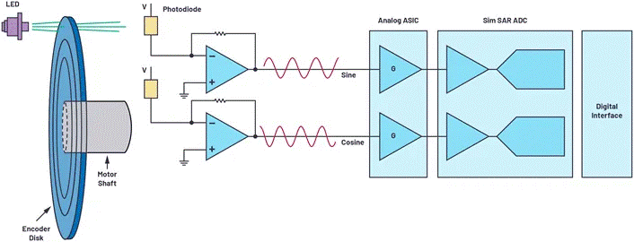 在低端應(yīng)用中,使用增量傳感器和比較器可能就能夠?qū)嵤┪恢脵z測,但在高端應(yīng)用中,則需要更加復(fù)雜的信號鏈。這些反饋系統(tǒng)包含位置傳感器,之后是模擬前端信號調(diào)理、ADC,以及ADC驅(qū)動器,數(shù)據(jù)先經(jīng)過它們,之后再進(jìn)入數(shù)字域。其中最精確的位置傳感器就是光學(xué)編碼器。光學(xué)編碼器由LED光源、連接到電機(jī)軸的標(biāo)記圓盤和光電探測器組成。圓盤包含不透明和透明的掩碼區(qū)域,可以阻隔光線或讓光線通過。光電探測器檢測這些光線,開/關(guān)光信號則轉(zhuǎn)換為電子信號。隨著圓盤轉(zhuǎn)動,光電探測器(與圓盤的模式配合)生成小的正弦和余弦信號(mV或µV等級)。這種系統(tǒng)是絕對位置光學(xué)編碼器采用的典型系統(tǒng)。這些信號進(jìn)入模擬信號調(diào)理電路(一般由分立式放大器或模擬PGA組成,用于獲取高達(dá)1 V峰峰值范圍的信號),通常是為了讓ADC輸入電壓范圍匹配最大動態(tài)范圍。每個放大的正弦和余弦信號之后都被同步采樣ADC的驅(qū)動放大器捕捉。ADC的每個通道都必須支持同步采樣,以便同時獲取正弦和余弦數(shù)據(jù)點(diǎn),由這些數(shù)據(jù)點(diǎn)組合提供軸的位置信息。ADC轉(zhuǎn)換結(jié)果會發(fā)送給ASIC或微控制器。電機(jī)控制器在每個PWM周期中查詢編碼器位置,然后根據(jù)接收的指令使用該數(shù)據(jù)來驅(qū)動電機(jī)。過去,為了集成到有限的板空間中,系統(tǒng)設(shè)計人員必須犧牲ADC速度或通道數(shù)。