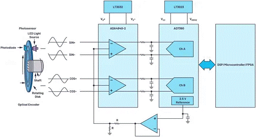 圖4所示為適合光學(xué)編碼器位置反饋系統(tǒng)的優(yōu)化解決方案示例。此電路很容易和絕對類型的光學(xué)編碼器連接,然后電路很容易捕捉來自編碼器的差分正弦和余弦信號。ADA4940-2前端放大器屬于雙通道、低噪聲全差分放大器,用于驅(qū)動AD7380,后者屬于雙通道、16位全差分4 MSPS同步采樣SAR ADC,采用3 mm × 3 mm小型LFCSP封裝。片內(nèi)2.5 V基準(zhǔn)電壓源允許此電路采用最少數(shù)量的組件。ADC的VCC和VDRIVE,以及放大器驅(qū)動器的電源軌道可由LDO穩(wěn)壓器供電,例如LT3023 和LT3032。當(dāng)這些參考設(shè)計相互連接時(例如,使用一個1024槽光學(xué)編碼器,在一個編碼器圓盤周期中生成1024個正弦和余弦周期),16位AD7380在216個代碼的各編碼器槽中采樣,將編碼器的整體分辨率提高到26位。4 MSPS吞吐速率確保捕捉到正弦和余弦周期的詳細(xì)信息,以及最新的編碼器位置信息。高吞吐速率支持實(shí)施片內(nèi)過采樣,從而縮短數(shù)字ASIC或微控制器將精確的編碼器位置反饋給電機(jī)時的時間延遲。AD7380片內(nèi)過采樣的另一個好處是:可以額外增加2位分辨率,可以和片內(nèi)分辨率增強(qiáng)功能配合使用。分辨率增強(qiáng)功能可以進(jìn)一步提升精度,最高可以達(dá)到28位。