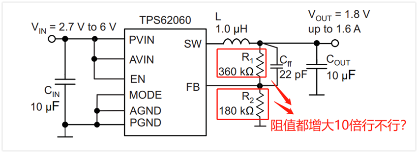 但是,總會有個別人可能想過:我想降低系統(tǒng)功耗,因此想讓FB的分壓電阻成倍增大,那到底有沒有風險呢?