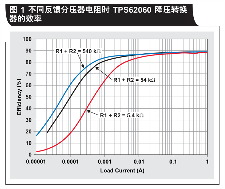 圖1表明,反饋電阻較低時,低負載的效率下降。本例中我們使用( TI )TPS62060EVM,其中 VIN =5V. VouT =1.8V,并且啟用節(jié)能模式。在高負載電流下,負載功耗遠大于電阻式反饋網(wǎng)絡的功耗。這就是不同R1和R2值的效率會集中在高負載電流的原因。但是,在低負載電流下,不同反饋電阻的效率差異更加明顯。這是因為,分壓器的電流主導了負載的電流。因此,要想擁有更高的輕負載效率,一種較好的設計方法是使用產(chǎn)品說明書單中建議的大反饋電阻值。如果在某個特定設計中輕負載效率并不重要,則可以在對效率無明顯影響的情況下使用更小的電阻。