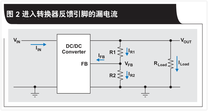 我們剛剛討論了如何利用大反饋電阻來提高效率。然而,選擇的電阻過大則會影響轉(zhuǎn)換器的輸出電壓精確度。因為存在進入轉(zhuǎn)換器反饋引腳的漏電流。