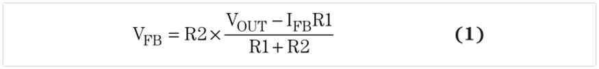 圖2顯示了電阻式反饋分壓器(R1和R2)的電流通路。反饋漏電流(IFB)固定不變時,R1的電流( lR1)隨著R1和R2值增加而減小。因此,分壓器電阻增加也就意味著進入反饋引腳的IR1漏電流百分比更大,并且R2的電流(1R2)降低,從而產(chǎn)生低于預期的反饋引腳電壓( VFB )。我們將 VFB 同一個內(nèi)部基準電壓比較,以此來設置輸出電壓,因此反饋電壓的任何一點誤差都會導致輸出電壓不精確。我們可以由基爾霍夫( Kirchhoff )電流定律推導出方程式1.其表明VFB為R1和R2的函數(shù):