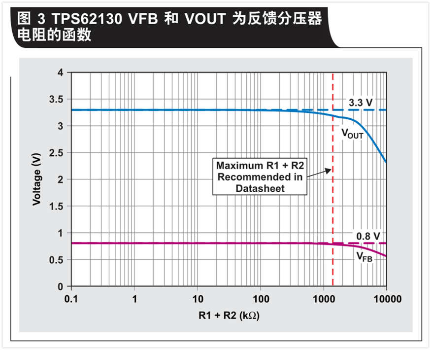 方程式1和TI的TPS62130降壓轉(zhuǎn)換器用于繪制反饋引腳電壓及相應輸出電壓情況,其為反饋分壓器電阻的函數(shù)(請參見圖3)。該電壓圖基于理想電阻,其可產(chǎn)生一個3.3V的輸出電壓,并且反饋引腳電壓為0.8V。需要考慮的唯一誤差項是產(chǎn)品說明書中規(guī)定的100nA最大反饋漏電流。