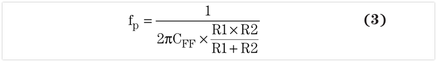 根據(jù)不同的控制拓撲,產(chǎn)品說明書可能會要求或者建議電阻式反饋網(wǎng)絡使用前饋電容( CFF )。圖4顯示了這種裝置。給電阻式分壓器添加前饋電容可產(chǎn)生零點和極點,增加轉(zhuǎn)換器的相位裕量和交叉頻率,從而獲得一個更高帶寬、高穩(wěn)定性的系統(tǒng)。