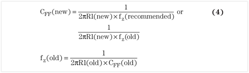 很明顯,零點和極點都與電阻分壓器和前饋電容所使用的值有關(guān)。因此,增加或降低電阻值來優(yōu)化效率、電壓精度或者噪聲,會改變系統(tǒng)的整體環(huán)路。要想保住穩(wěn)定性,需要根據(jù)前面的零點或者是產(chǎn)品說明書建議的零點(哪個值可用,就用哪個值),用方程式4計算一個新的CFF值: