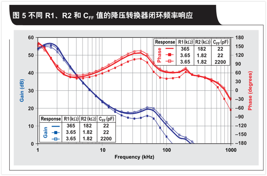 對于一個在其控制拓撲中使用前饋電容的轉(zhuǎn)換器來說,改變電阻式分壓器的值很容易讓轉(zhuǎn)換器穩(wěn)定降低。但是這個例子僅僅表明,只要前饋電容調(diào)節(jié)適當,改變這些值便可維持相同的頻率響應和瞬態(tài)響應。