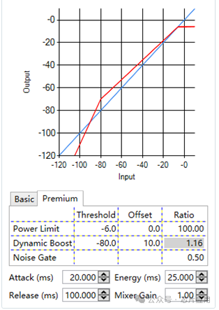DRC在音頻算法中是非常核心的模塊,英文全稱dynamic range control,作用是調(diào)整音頻信號(hào)的動(dòng)態(tài)范圍,根據(jù)輸入信號(hào)的大小自動(dòng)調(diào)整增益;究梢缘脑O(shè)置參數(shù)如下: