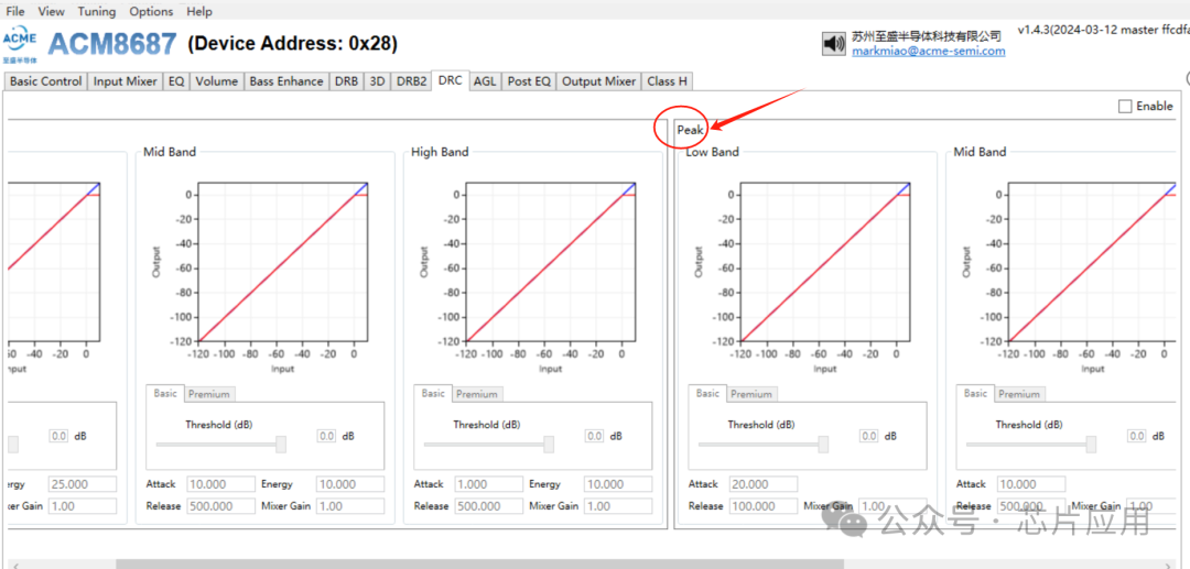 另外一個(gè)弊端例如傳統(tǒng)DRC信號(hào)突變時(shí),前幾個(gè)波形失真的問題。由于傳統(tǒng)DRC是計(jì)算RMS,必然有幾個(gè)周期的波形是可能失真的。ACM8687除了RMS DRC之外,采用專利技術(shù),加入PEAK檢測(cè)。信號(hào)經(jīng)過peak加權(quán)后跟RMS值比較,決定先進(jìn)入peak DRC還是RMS DRC。例如前幾個(gè)波形失真問題,可以通過調(diào)整peak DRC的attack來調(diào)整失真。