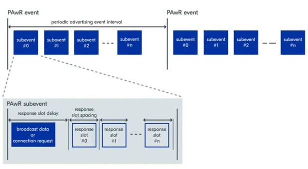 為了解釋其工作原理,我們將使用廣播者和觀察者的命名規(guī)則。廣播并不新鮮,數(shù)據(jù)由廣播者發(fā)送,觀察者掃描接收。PAwR 的新穎之處在于,廣播數(shù)據(jù)是在確定的時(shí)間段內(nèi)以小數(shù)據(jù)包的形式組織起來的,觀察者可以精確地與之同步并作出響應(yīng)。數(shù)據(jù)在 PAwR 事件中發(fā)送,而 PAwR 事件由 PAwR 子事件組成。每個(gè)觀察者可與一個(gè)或多個(gè)子事件同步,在同步后,觀察者只在這些特定的時(shí)間段內(nèi)主動(dòng)接收數(shù)據(jù)。