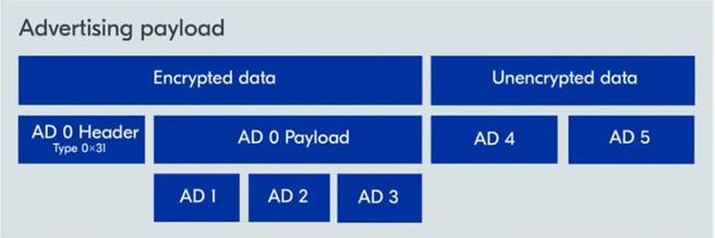 廣播數(shù)據(jù) 0 封裝 AD 1-3,這些數(shù)據(jù)是加密的。隨后是 AD 4 和 AD 5,它們是未加密的。這樣就可以靈活地保留一些非關(guān)鍵的廣播數(shù)據(jù),供任何觀察者解讀,例如 AD 類型 0x01(標(biāo)志)或 0x09(完整本地名稱)。