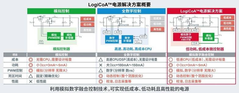 LogiCoA™是基于融合了數(shù)字元素的設(shè)計理念開發(fā)而成的品牌,可以更大程度地發(fā)揮模擬電路的性能。LogiCoA™電源解決方案是業(yè)界先進(jìn)的“模擬數(shù)字融合控制”電源,將以LogiCoA™微控制器為核心的數(shù)字控制部分和由Si MOSFET等功率器件組成的模擬電路結(jié)合在一起的方式,在業(yè)界尚屬初創(chuàng)。在全數(shù)字控制電源中,可以由低位微控制器來處理由高速CPU*3和DSP*4等數(shù)字控制器承擔(dān)的功能,從而能以低功耗和低成本來實現(xiàn)模擬控制電源難以實現(xiàn)的高性能。另外,該解決方案可以在LogiCoA™微控制器中存儲電流和電壓值等各種設(shè)置值,因此可根據(jù)電源電路補(bǔ)償外圍元器件的性能波動。與模擬控制電源相比,這種電源無需考慮設(shè)計裕量,從而有助于縮小電源的體積并提高電源的可靠性。此外,由于工作日志數(shù)據(jù)可以存儲在微控制器內(nèi)的非易失性存儲器中,因此非常適用于要求存儲日志作為故障時備份的工業(yè)設(shè)備電源。