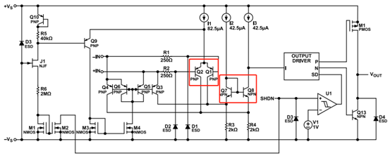 上圖(圖3)是ADA4530-1內(nèi)部輸入架構(gòu),信號(hào)輸入后直接進(jìn)入一對(duì)MOSFET管子。同樣作為電壓控制型器件,MOSFET相比JFET而言,輸入阻抗更高,因此做出的運(yùn)放在失調(diào)電流以及偏置電流方面的參數(shù)更好。MOSFET對(duì)于靜電放電抵抗能力不佳,這類(lèi)器件在運(yùn)放電路中,前端通常需要添加上二極管(如上圖圖3黃框所示)進(jìn)行保護(hù),MOSFET的溝道在表面,不像JFET在體內(nèi),故JFET型輸入的運(yùn)放在噪聲方面性能更優(yōu)異。