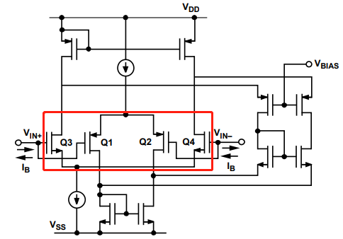 我們不難發(fā)現(xiàn),與前文三種不支持軌到軌的輸入架構(gòu)相比,軌到軌輸入運(yùn)放在輸入的時(shí)候額外多了一對(duì)管子,無(wú)論是三極管還是MOS管。