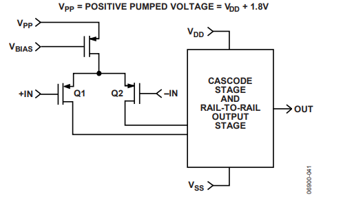 內(nèi)部電荷泵用一個(gè)高電壓,可以使輸入信號(hào)始終經(jīng)過(guò)一個(gè)差分對(duì)而不跳到另外一個(gè)。某種意義上,是從根本消除了交越失真。