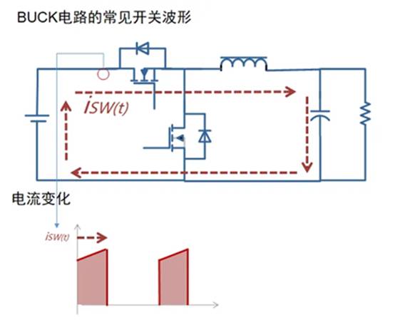電源輸入電容與開(kāi)關(guān)環(huán)路形成一個(gè)電流環(huán)。這個(gè)電流環(huán)路的變化幅度大,Iout的幅度。頻率是開(kāi)關(guān)頻率。DCDC芯片開(kāi)關(guān)過(guò)程中產(chǎn)生,這個(gè)電流環(huán)產(chǎn)生的電流的變化,包含了較快的di/dt。