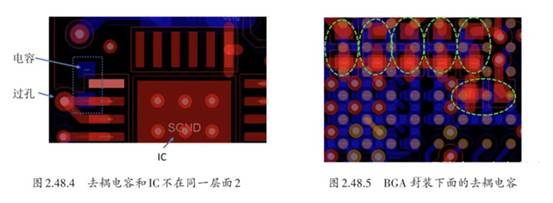 常見(jiàn)的 BGA封裝,其去耦電容通常放在 BGA下面,即背面。由于 BGA 封裝引腳密度大,因此去 耦電容一般放的不是很多,但應(yīng)盡量多擺放一些,如圖2.48.5所示。