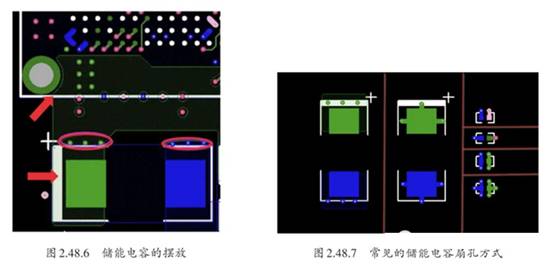 儲(chǔ)能電容的作用就是保證IC在用電時(shí),能在最短的時(shí)間內(nèi)提供電能。儲(chǔ)能電容的容值一般比較 大,對(duì)應(yīng)的封裝也比較大。在PCB中,儲(chǔ)能電容可以離器件遠(yuǎn)一些,但也不能太遠(yuǎn),如圖2.48.6所示。常見(jiàn)的儲(chǔ)能電容扇孔方式,如圖2.48.7所示。