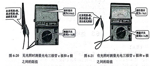 在進行受光檢測時,萬用表仍選擇R×1k擋,黑表筆接c極,紅表筆接e極,讓光線照射光電三極管受光面,正常光電三極管阻值應(yīng)變小。在無光和受光檢測時阻值變化越大,表明光電三極管靈敏度越高,如圖6—20、圖6—21所示。