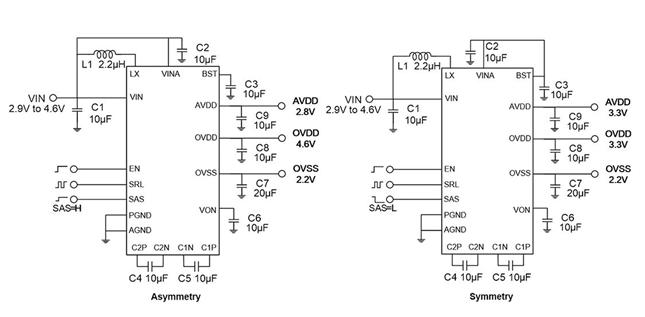 在對稱模式下,SAS設(shè)置為Low電平,AVDD、OVDD和OVSS的初始輸出電壓分別為3.3V、3.3V和-2.2V。在不對稱模式下,SAS設(shè)置為High電平,AVDD、OVDD和OVSS的初始輸出電壓分別為2.8V、4.6V和-2.2V。