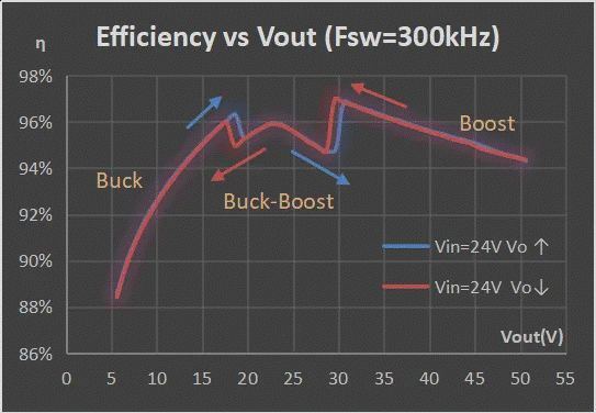 DIA89360能夠在降壓、四開(kāi)關(guān)升降壓、和升壓工作區(qū)之間平穩(wěn)地轉(zhuǎn)換。