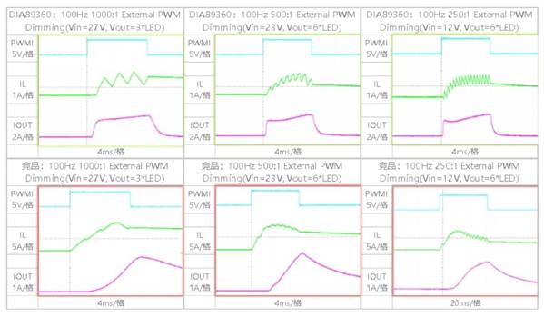 1. 拓展高調(diào)光比應(yīng)用。LED電流路徑中串聯(lián)調(diào)光FET是實(shí)現(xiàn)高調(diào)光比所必需的;當(dāng)PWM信號(hào)為低時(shí),串聯(lián)的調(diào)光FET斷開(kāi)可以防止輸出電容放電,確保了LED電流能夠?qū)崿F(xiàn)快速的上升和下降,以此來(lái)響應(yīng)高調(diào)光比的PWM輸入,如DIA89360波形;在沒(méi)有任何調(diào)光FET的情況下,輸出電容放電,輸出電壓降低,LED電流的建立有一定的延時(shí),如競(jìng)品波形,當(dāng)調(diào)光比高到一定數(shù)值時(shí),LED電流無(wú)法快速響應(yīng)PWM輸入。