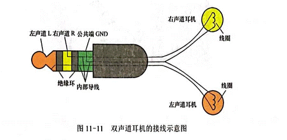 圖11—11所示是雙聲道耳機的接線示意圖,從圖中可以看出,耳機插頭有L、R、公共三個導電節(jié),由兩個絕緣環(huán)隔開,三個導電節(jié)內(nèi)部接出三根導線,一根導線引出后一分為二,三根導線變?yōu)樗母髢蓛膳c左、右聲道耳機線圈連接。