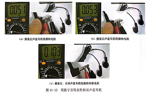 用數(shù)字萬用表檢測雙聲道耳機如圖11—13所示,萬用表選擇2k2擋,圖11—13(a)所示是測量左聲道耳機線圈的電阻,顯示電阻值為510(0.051kQ),圖11—13(b)所示是測量右聲道耳機線圈的電阻,顯示電阻值為532,圖11—13(c)所示是測量左、右兩聲道耳機線圈的串聯(lián)電阻,顯示電阻值為1032。