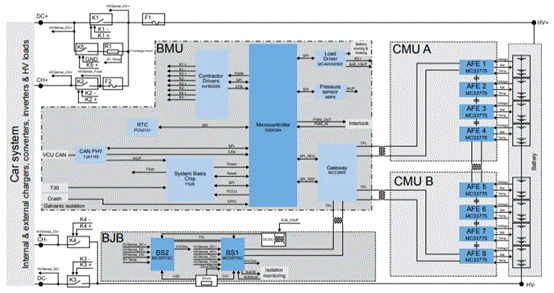 BMS由電池管理單元(BMU)、電池監(jiān)測(cè)單元(CMU)和電池接線盒(BJB)3個(gè)模塊組成,如何在作為系統(tǒng)大腦的BMU、CMU和BJB子系統(tǒng)之間建立BMS內(nèi)部通信也需要設(shè)計(jì)人員在選擇方案時(shí)做出仔細(xì)評(píng)估。