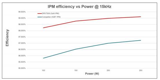 DRV7308 是一個集成了六只氮化鎵的先進智能功率模塊IPM,通過其高度集成的設計,實現(xiàn)了超過99%的逆變器效率,功耗可降低 50%,這一性能優(yōu)勢不僅顯著提升了電機驅(qū)動系統(tǒng)的能效,還大幅降低了能源損耗,為用戶提供了全新的功率管理解決方案。根據(jù)德州儀器銷售與市場應用經(jīng)理 Charlie Munoz 和系統(tǒng)工程師張宏亮在發(fā)布會上的介紹,DRV7308 實現(xiàn)了業(yè)內(nèi)較低的死區(qū)時間和低傳播延遲(均小于 200ns),這可達到更高的脈寬調(diào)制 (PWM) 開關(guān)頻率,從而減少可聞噪聲和系統(tǒng)振動。這些優(yōu)勢與 DRV7308 更高的功率效率和集成特性相得益彰,還能減少電機發(fā)熱問題,進而提高系統(tǒng)可靠性并延長使用壽命。