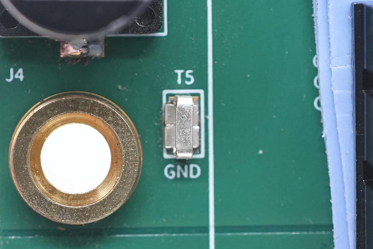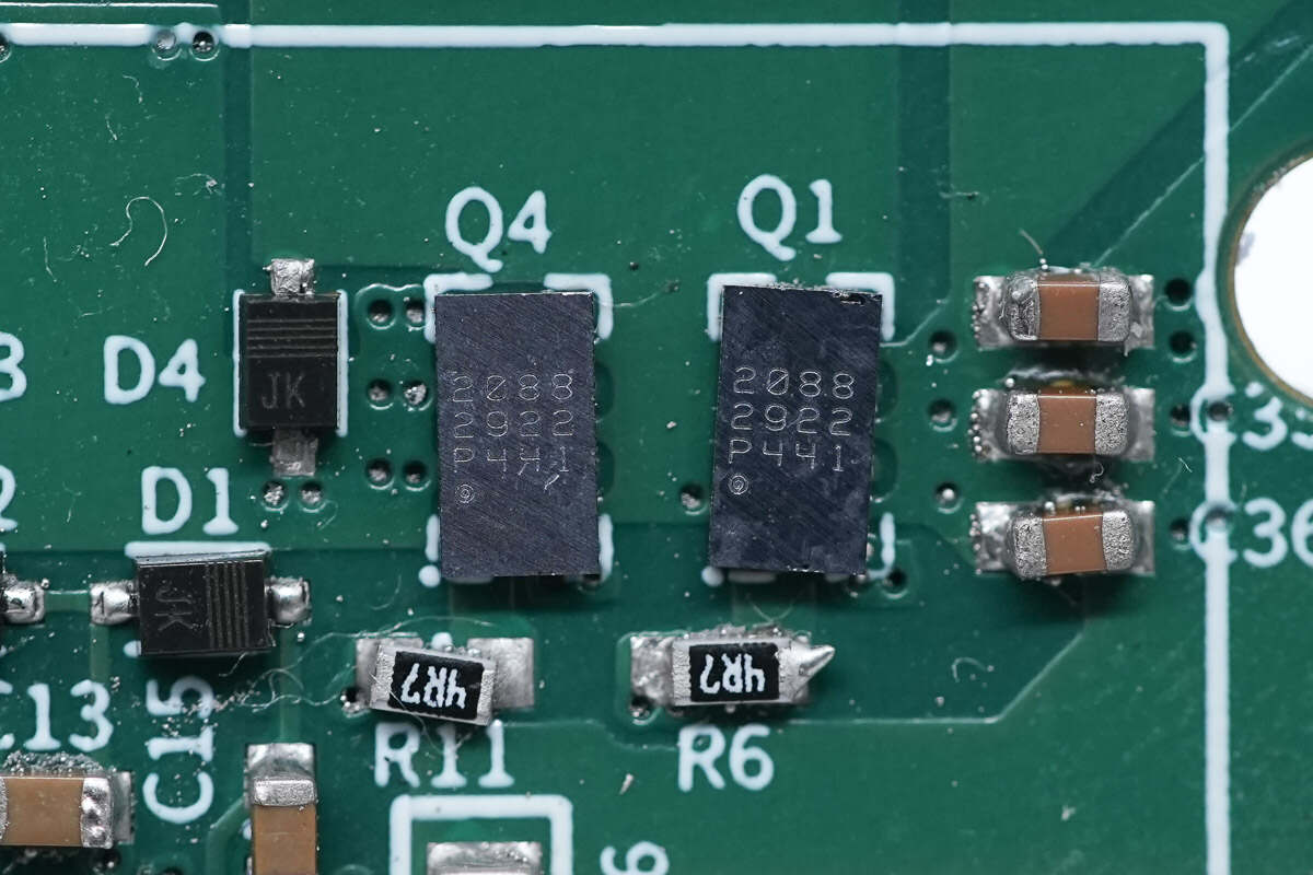 取下覆蓋的散熱片和導(dǎo)熱墊,在下方設(shè)有同步升降壓控制器和氮化鎵開關(guān)管。