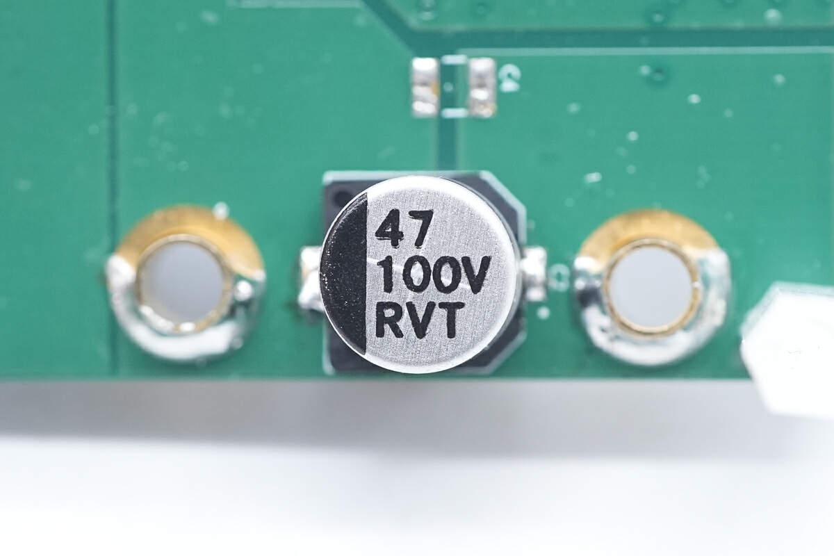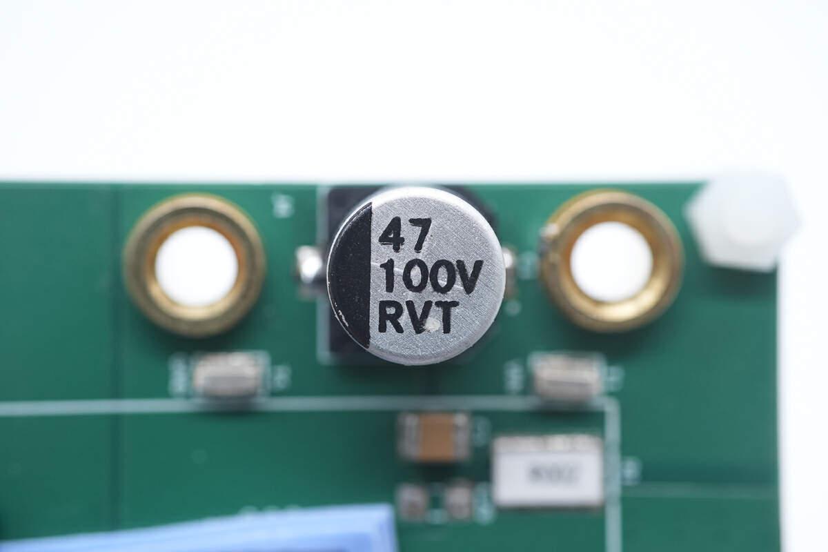 對應(yīng)輸入和輸出端子,均焊接兩顆47μF100V貼片電解電容濾波。