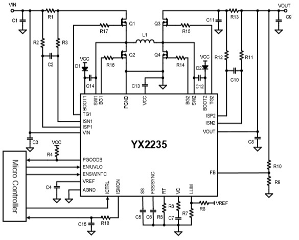 YX2235是一款同步升降壓控制器,適用于驅動高效電源轉換器中的MOSFET或氮化鎵(GaN)等功率器件。它支持高達35V的寬輸入和輸出電壓范圍, 并可在降壓、升降壓和升壓模式之間無縫轉換。 YX2235 集成了具有UVLO保護功能的上管和下管柵極驅動器。它提供可編程電感峰值電流限制和輸出平均電流限制功能,并通過ISMON提供輸出瞬 時電流監(jiān)控功能。CC/CV 調節(jié)功能使其適用于電池充電系統(tǒng)。