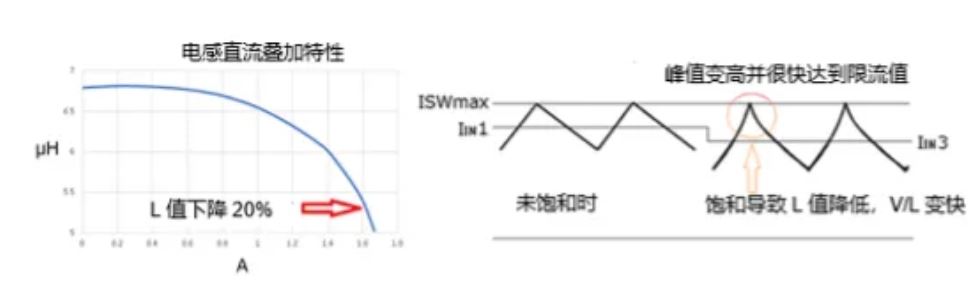 前面的計(jì)算是在電感沒有誤差的條件下進(jìn)行的,但實(shí)際上電感是有誤差的,并且最大輸出電流會隨著誤差導(dǎo)致的電感紋波電流的增加而減小。另外,電感器具有“直流疊加特性”,也就是當(dāng)提高電流時(shí),磁芯材料的磁飽和會導(dǎo)致相對磁導(dǎo)率降低,從而使電感值減小。在最大負(fù)載時(shí),由于電感電流增加會使電感值變小、電感紋波電流的電流增加速度(V/L)變快(波形變陡峭),峰值很快就會達(dá)到限流值,輸入電流減小至IIN3,最終導(dǎo)致可能無法確保預(yù)期的最大輸出電流。