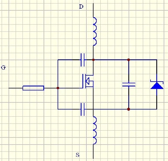 一般認為MOSFET(MOS管)是電壓驅(qū)動的,不需要驅(qū)動電流。然而,在MOS管的G極和S極之間有結(jié)電容存在,這個電容會讓驅(qū)動MOS變的不那么簡單。下圖的3個電容為MOS管的結(jié)電容,電感為電路走線的寄生電感: