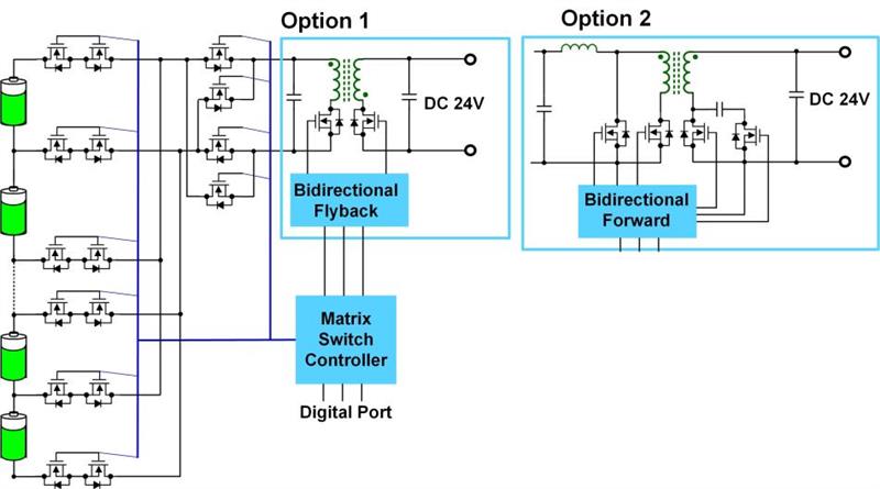 雙向反激式轉(zhuǎn)換器或正向式轉(zhuǎn)換器的初級(jí)側(cè)連接到電池組或輔助電源軌。在這種布置中,每個(gè)電池都可以與電池組或輔助電源軌交換能量(充電或放電期間)。如上所述,開關(guān)矩陣加變壓器的主要優(yōu)勢(shì)在于只需要一個(gè)變壓器。
