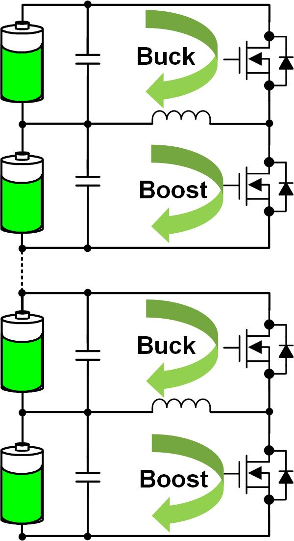 降壓-升壓主動(dòng)平衡器采用更簡(jiǎn)單的方法,利用常用的降壓和升壓電池充電器技術(shù)。降壓-升壓主動(dòng)平衡不是將電荷移動(dòng)到電池組的各個(gè)位置或單獨(dú)的電源軌,而是將電荷移動(dòng)到直接相鄰的電池。這大大簡(jiǎn)化了平衡電路,并利用多個(gè)平衡器的同時(shí)操作將電荷分配到整個(gè)電池組中。