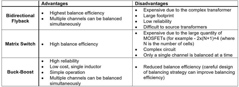 在三種類型的主動(dòng)平衡器中,雙向降壓-升壓主動(dòng)平衡器簡(jiǎn)單、可靠。表 1比較了這三種主動(dòng)平衡方法。