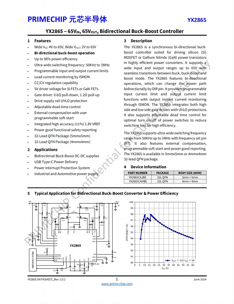 元芯YX2865支持寬輸入輸出電壓范圍,能夠在降壓、升壓和升降壓模式間無(wú)縫切換。其雙向操作功能通過DIR引腳實(shí)現(xiàn)電力路徑的雙向控制,電源轉(zhuǎn)換效率高達(dá)98%。具有超寬開關(guān)頻率范圍和可調(diào)死區(qū)時(shí)間控制,優(yōu)化了開關(guān)時(shí)序,進(jìn)一步提升系統(tǒng)效率。同時(shí),集成的多種保護(hù)功能簡(jiǎn)化了設(shè)計(jì),提高了系統(tǒng)的可靠性和安全性。YX2865在各種應(yīng)用場(chǎng)景中的競(jìng)爭(zhēng)力非常顯著,無(wú)論是氮化鎵充電器、雙向降壓-升壓DC-DC電源,還是USB Type-C電源傳輸?shù)雀咭箢I(lǐng)域,YX2865都能提供穩(wěn)定可靠的電源管理解決方案。 |