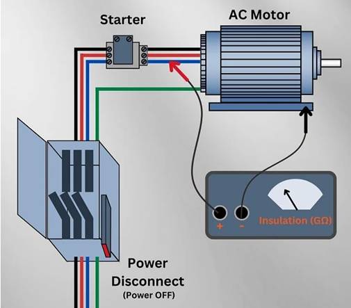 連接 Megger:將兆歐表的引線連接到電機(jī)輸入端子。正極引線連接到電機(jī)的繞組,而負(fù)極引線連接到電機(jī)的框架或接地。這種配置允許兆歐表測量從繞組到地面的絕緣電阻。圖 3 和圖 4 分別以圖表方式演示了交流和直流電機(jī)的兆歐表測試的正確布局。